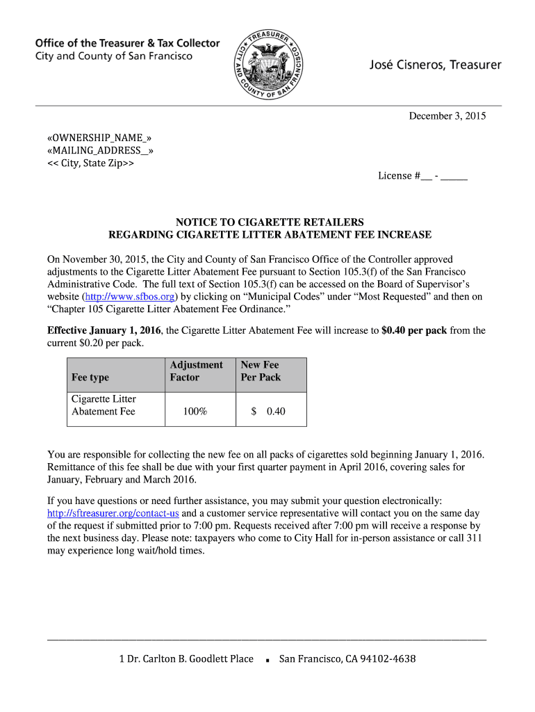 December 3, 2015, OWNERSHIP NAME MAILING ADDRESS City, State Zip License # NOTICE TO CIGARETTE RETAILERS REGARDING CIGARETTE LITTER ABATEMENT FEE INCREASE On November 30, 2015, the City and County