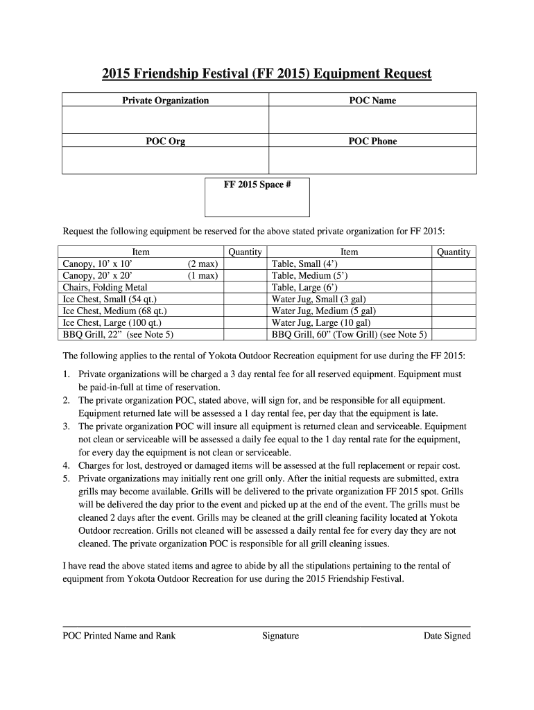 2015 Friendship Festival (FF 2015) Equipment Request Private Organization POC Name POC Org POC Phone FF 2015 Space # Request the following equipment be reserved for the above stated private organization