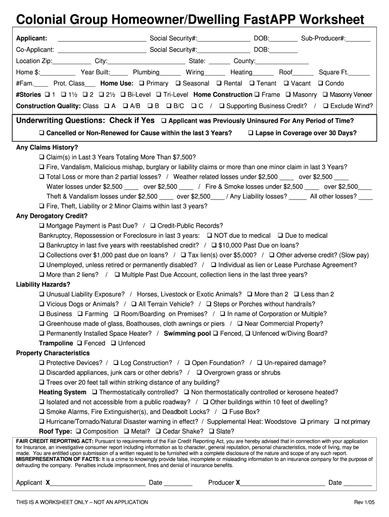 Colonial Group Homeowner/Dwelling Fast APP Worksheet Applicant: Social Security#: DOB: Producer#: Applicant: Social Security#: DOB: Location Zip: City: State: County: Home $: Year Built: Plumbing