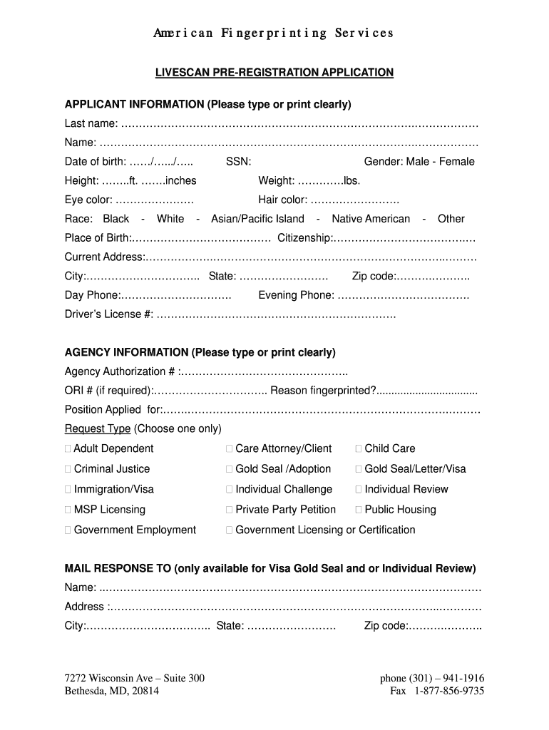 American Fingerprinting Services LIVES CAN PREREGISTRATION APPLICATION APPLICANT INFORMATION (Please type or print clearly) Last name:. Name:. Date of birth: /.../. SSN: Gender: Male Female Height: