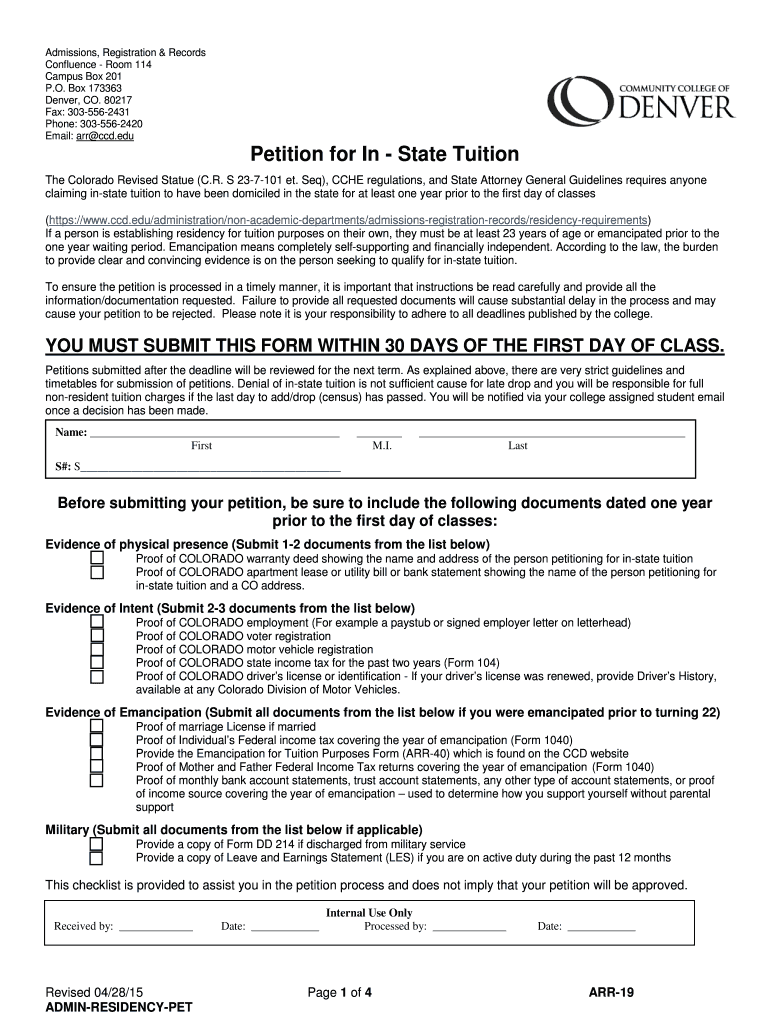 Admissions, Registration & Records Confluence Room 114 Campus Box 201 P.O. Box 173363 Denver, CO. 80217 Fax: 3035562431 Phone: 3035562420 Email: arr cc'd.edu Petition for In State Tuition The Colorado