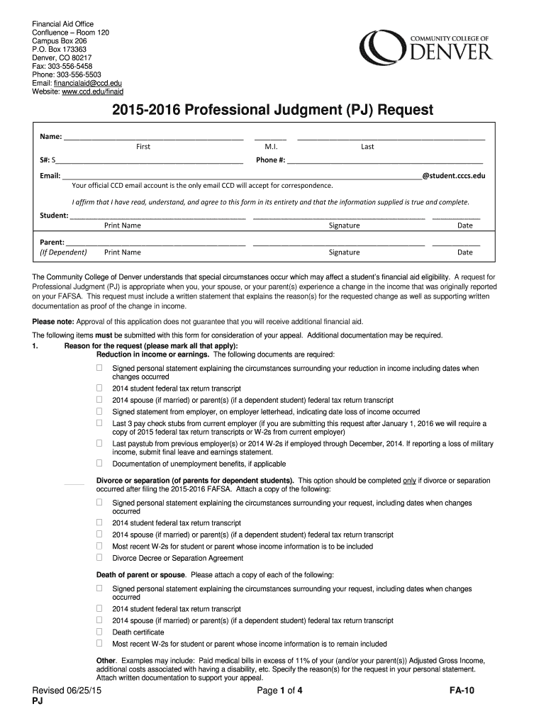 Get the free edu/finaid 20152016 Professional Judgment (PJ) Request Name: First M - ccd