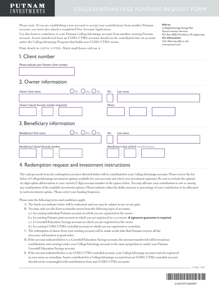 E CO L E G E A DVA N TAG E F U N D I N G R E Q U E S T F O R M Please note: If you are establishing a new account to accept your contributions from another Putnam account, you must also attach a completed