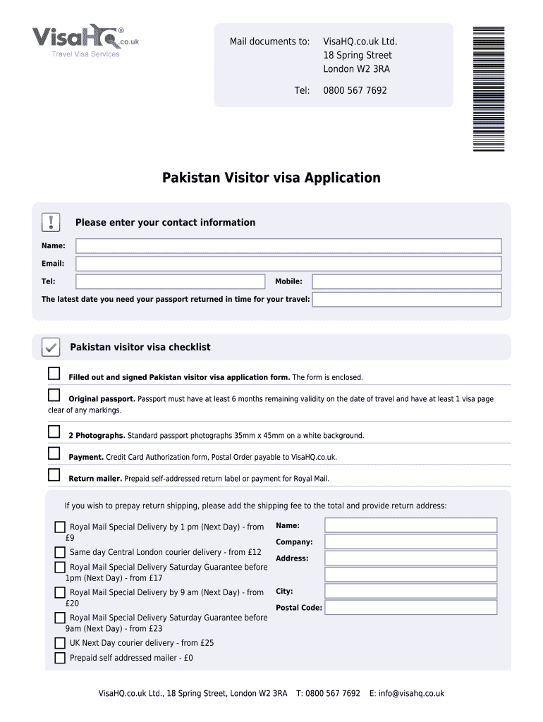 Mail documents to: Tel: Visa HQ.co.UK Ltd. 18 Spring Street London W2 3RA 0800 567 7692 Pakistan Visitor visa Application Please enter your contact information Name: Email: Tel: Mobile: The latest