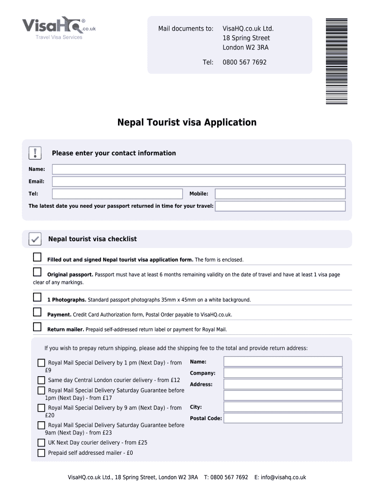 Mail documents to: Tel: Visa HQ.co.UK Ltd. 18 Spring Street London W2 3RA 0800 567 7692 Nepal Tourist visa Application Please enter your contact information Name: Email: Tel: Mobile: The latest date