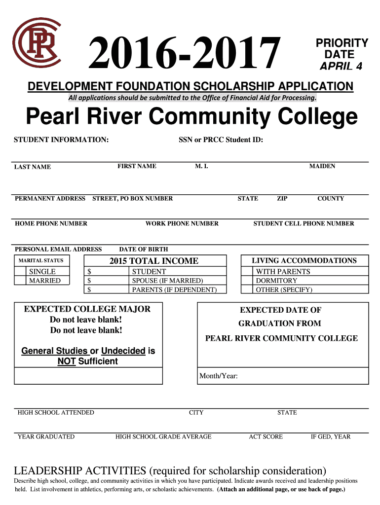 20162017 PRIORITY DATE APRIL 4 DEVELOPMENT FOUNDATION SCHOLARSHIP APPLICATION All applications should be submitted to the Office of Financial Aid for Processing. Pearl River Community College STUDENT