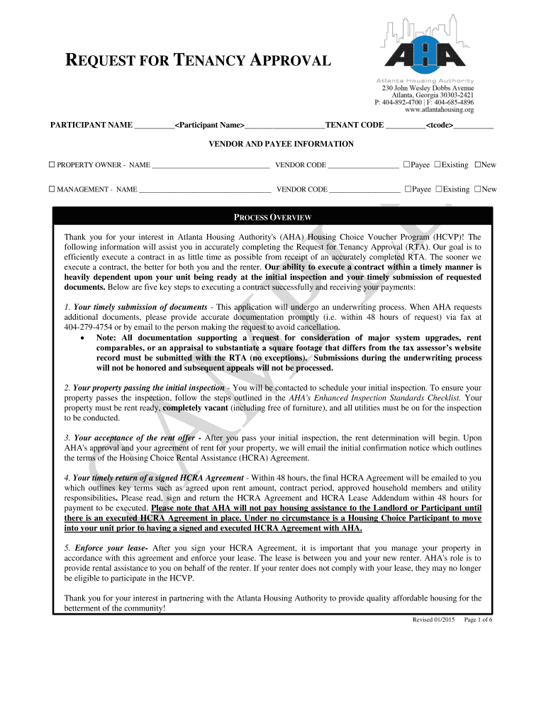 REQUEST FOR TENANCY APPROVAL PARTICIPANT NAME TENANT CODE VENDOR AND PAYEE INFORMATION PROPERTY OWNER NAME VENDOR CODE Payee Existing New MANAGEMENT NAME VENDOR CODE Payee Existing New PROCESS OVERVIEW