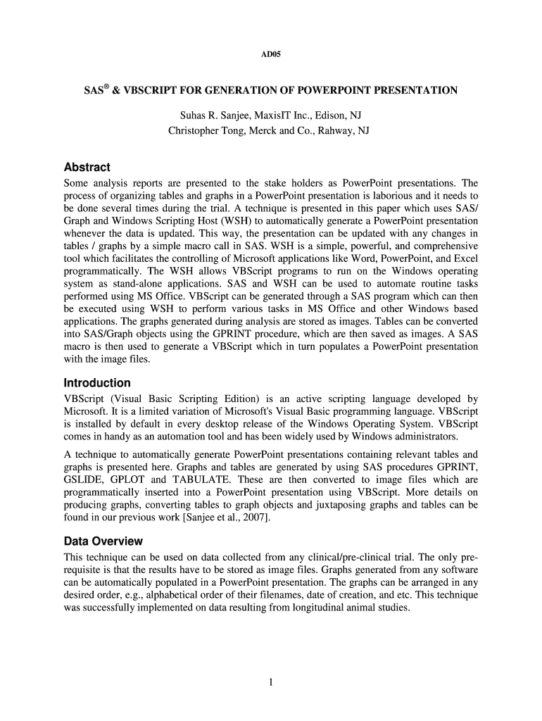 AD05 SAS & VBScript FOR GENERATION OF PowerPoint PRESENTATION Has R. Sanjeev, Maxis IT Inc., Edison, NJ Christopher Tong, Merck and Co., Rah way, NJ Abstract Some analysis reports are presented to