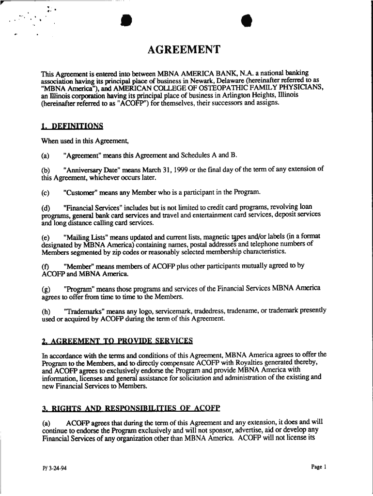 This document outlines the agreement between MBNA America Bank and the American College of Osteopathic Family Physicians regarding the provision of financial services to ACOFP Members, including the