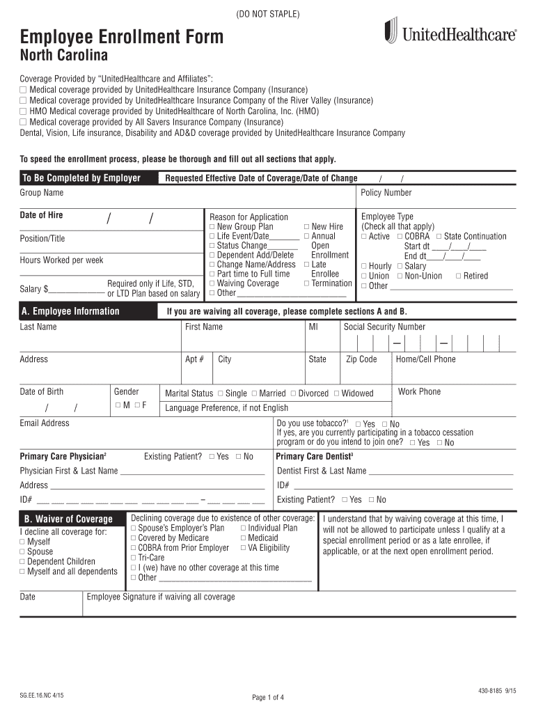 (DO NOT STAPLE) Employee Enrollment Form North Carolina Coverage Provided by UnitedHealthcare and Affiliates: I Medical coverage provided by UnitedHealthcare Insurance Company (Insurance) I Medical