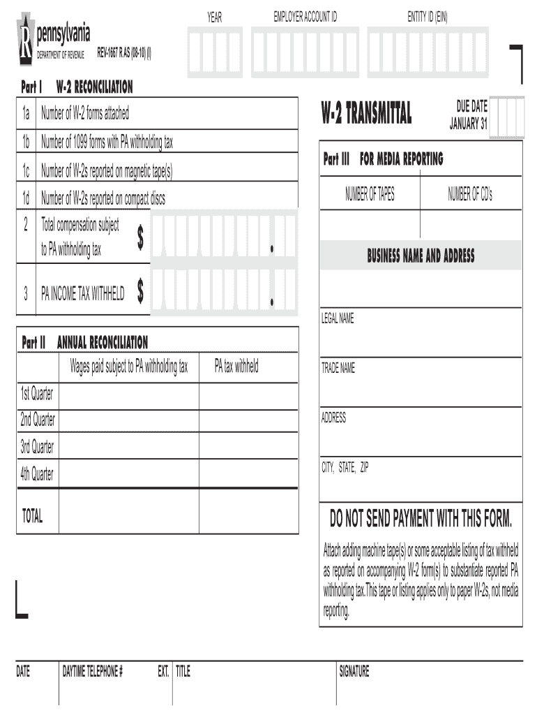 EMPLOYER ACCOUNT ID YEAR ENTITY ID (EIN) REV1667 R AS (0810) (I) Part I 1a 1b 1c 1d 2 3 W2 RECONCILIATION W2 TRANSMITTAL Number of W2 forms attached Number of 1099 forms with PA withholding tax Number