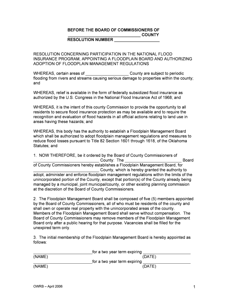 BEFORE THE BOARD OF COMMISSIONERS OF COUNTY RESOLUTION NUMBER RESOLUTION CONCERNING PARTICIPATION IN THE NATIONAL FLOOD INSURANCE PROGRAM, APPOINTING A FLOODPLAIN BOARD AND AUTHORIZING ADOPTION OF