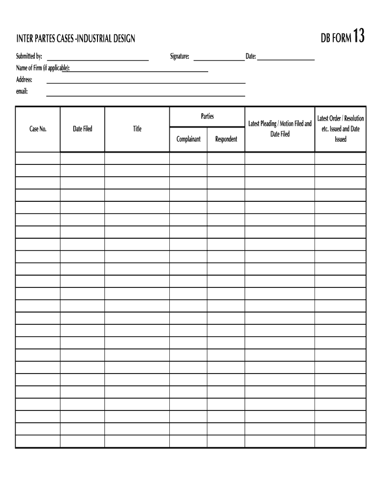 DB FORM INTER PARTIES CASES INDUSTRIAL DESIGN Submitted by: Name of Firm (if applicable): Address: email: Signature: Date: Parties Case No. Date Filed Title Complainant 13 Respondent Latest Pleading