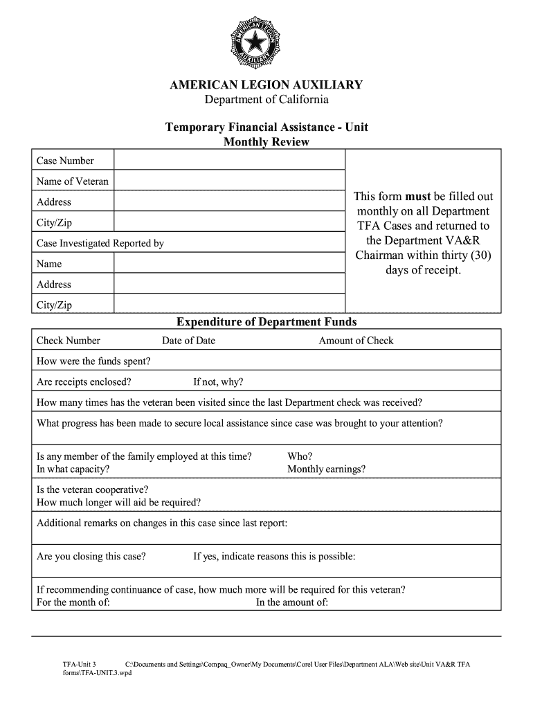 AMERICAN LEGION AUXILIARY Department of California Temporary Financial Assistance Unit Monthly Review Case Number Name of Veteran This form must be filled out monthly on all Department TFA Cases and
