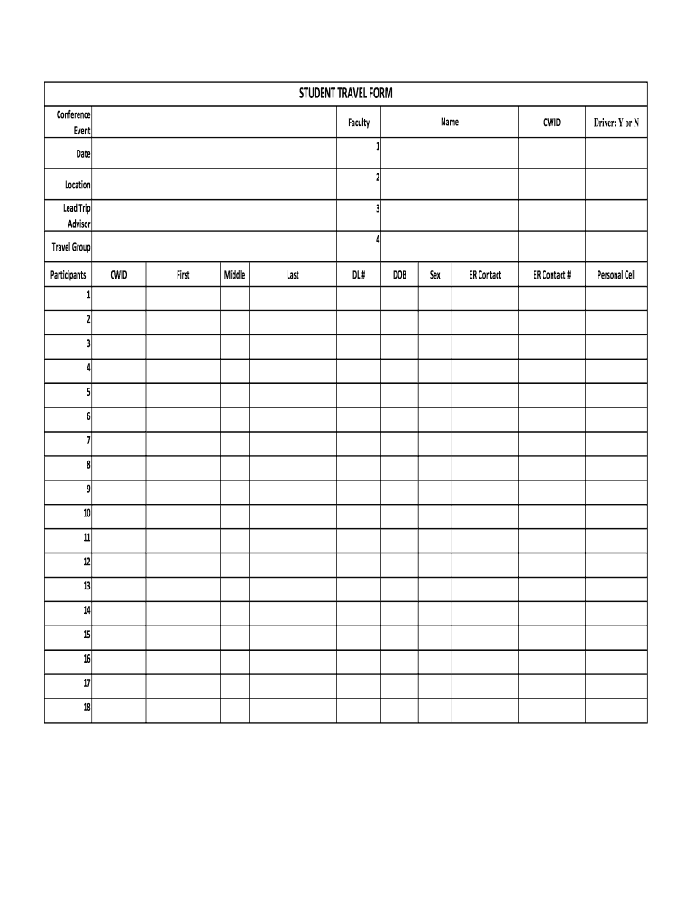 STUDENT TRAVEL FORM Conference Event Lead Trip Advisor 4 5 6 7 8 9 10 11 12 13 14 15 16 17 18 Personal Cell 4 CID 3 ER Contact # 3 Travel Group 2 Driver: Y or N 2 Location 1 CID 1 Date Participants