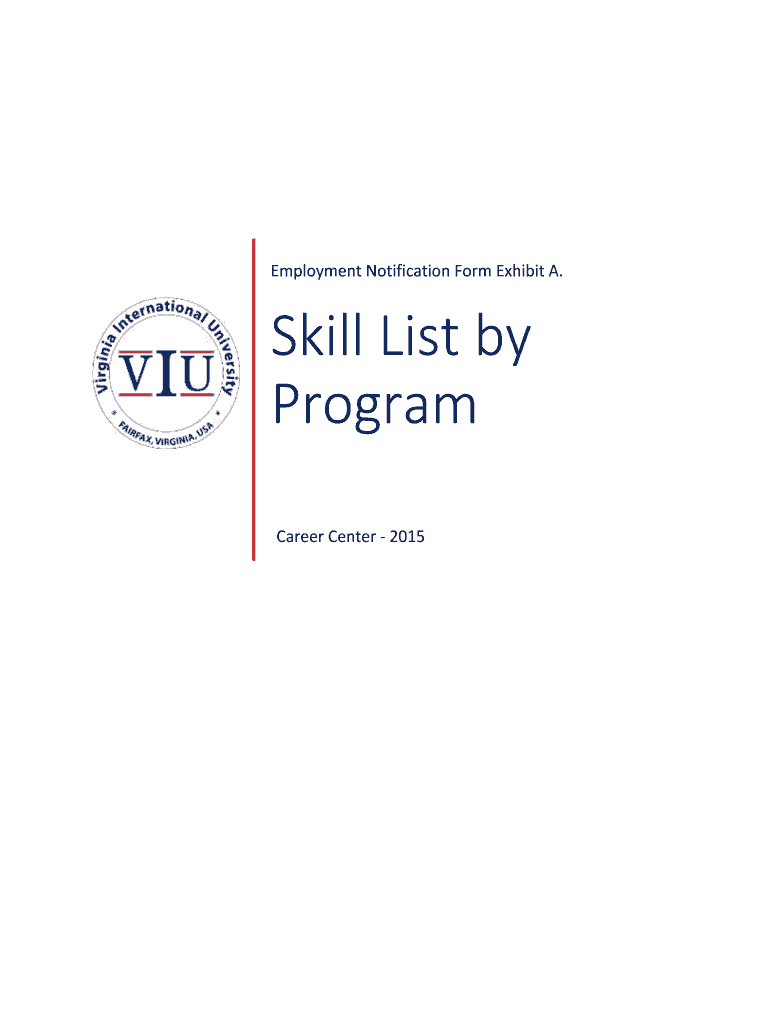 Employment Notification Form Exhibit A. Skill List by Program Career Center 2015VIRGINIA INTERNATIONAL UNIV ER CITY SKILL LIST BY P ROGRAMINSTRUCTIONS Find your School and Program in this document