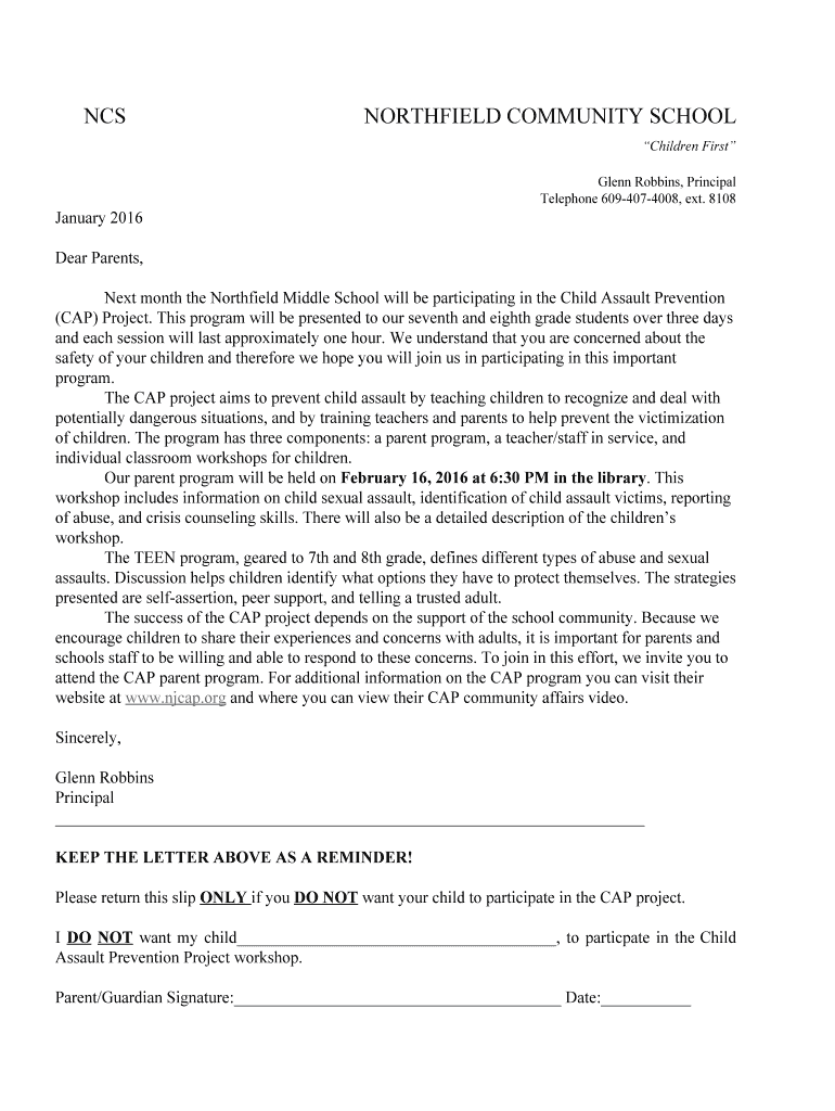 NCS NORTHFIELDCOMMUNITYSCHOOL ChildrenFirst Glenn Robbins, Principal Telephone6094074008,ext.8108 January2016 Airplanes, NextmonththeNorthfieldMiddleSchoolwillbeparticipatingintheChildAssaultPrevention