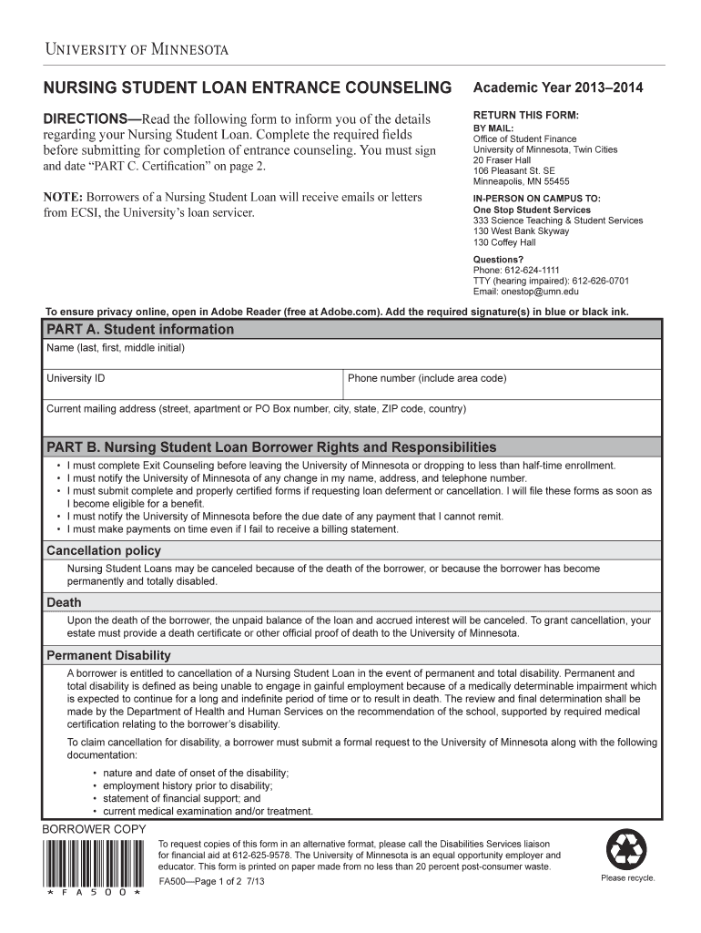 NURSING STUDENT LOAN ENTRANCE COUNSELING Academic Year 20132014 DIRECTIONSRead the following form to inform you of the details regarding your Nursing Student Loan. Complete the required fields before