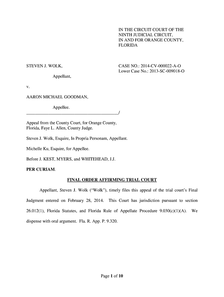 IN THE CIRCUIT COURT OF THE NINTH JUDICIAL CIRCUIT, IN AND FOR ORANGE COUNTY, FLORIDASTEVEN J. WORK, CASE NO.: 2014CV000022AO Lower Case No.: 2013SC009018OAppellant, v. AARON MICHAEL GOODMAN, Appealed.