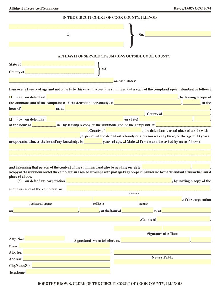 Print Form Clear Form (Rev. 3/15/07) CCG 0074 Affidavit of Service of Summons IN THE CIRCUIT COURT OF COOK COUNTY, ILLINOIS v. No. AFFIDAVIT OF SERVICE OF SUMMONS OUTSIDE COOK COUNTY State of County