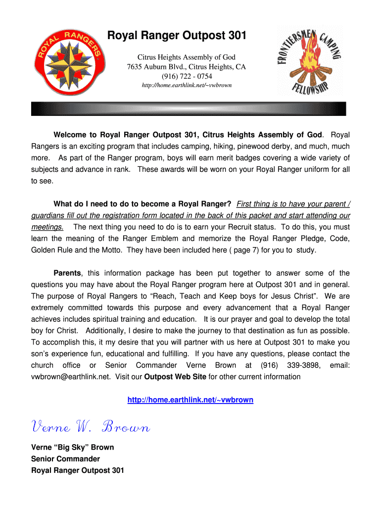 Royal Ranger Outpost 301 Citrus Heights Assembly of God 7635 Auburn Blvd., Citrus Heights, CA (916) 722 0754 http://home.earthlink.net/vwbrown Welcome to Royal Ranger Outpost 301, Citrus Heights Assembly
