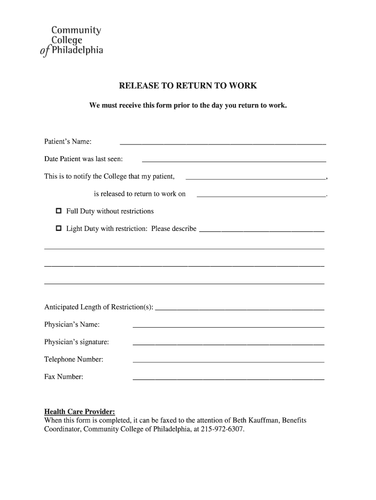Get the free RELEASE TO RETURN TO WORK - Community College of Philadelphia