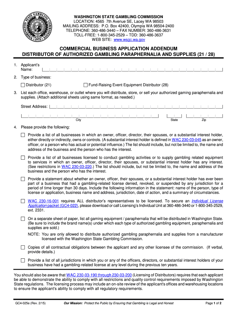 WASHINGTON STATE GAMBLING COMMISSION LOCATION: 4565 7th Avenue SE, Lacey WA 98503 MAILING ADDRESS: P.O. Box 42400, Olympia WA 985042400 TELEPHONE: 3604863440 FAX NUMBER: 3604863631 TOLL-FREE: 18003452529