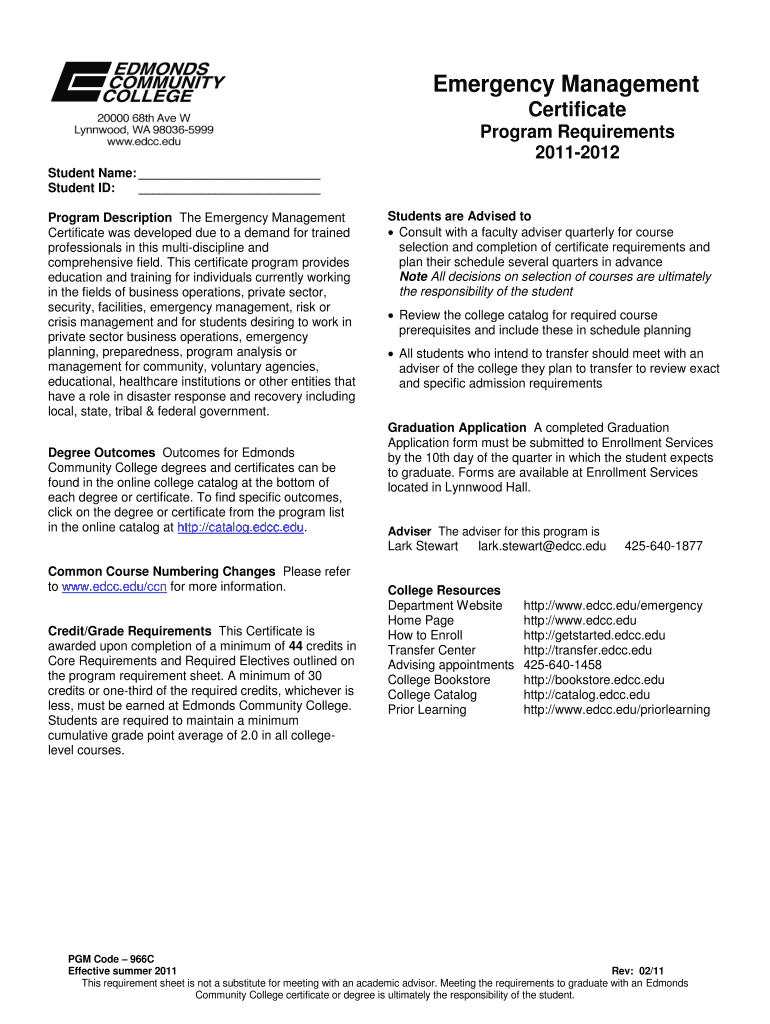 Emergency Management Certificate Program Requirements 20112012 Student Name: Student ID: Program Description The Emergency Management Certificate was developed due to a demand for trained professionals