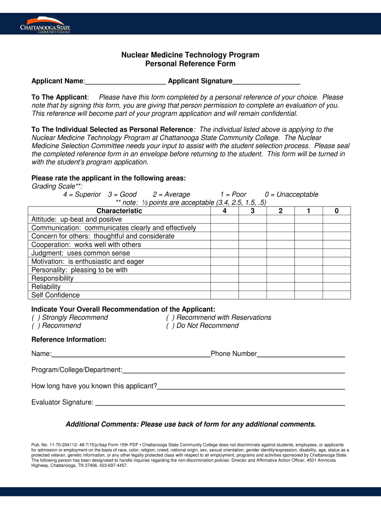 Nuclear Medicine Technology Program Personal Reference Form Applicant Name: Applicant Signature To The Applicant: Please have this form completed by a personal reference of your choice. Please note