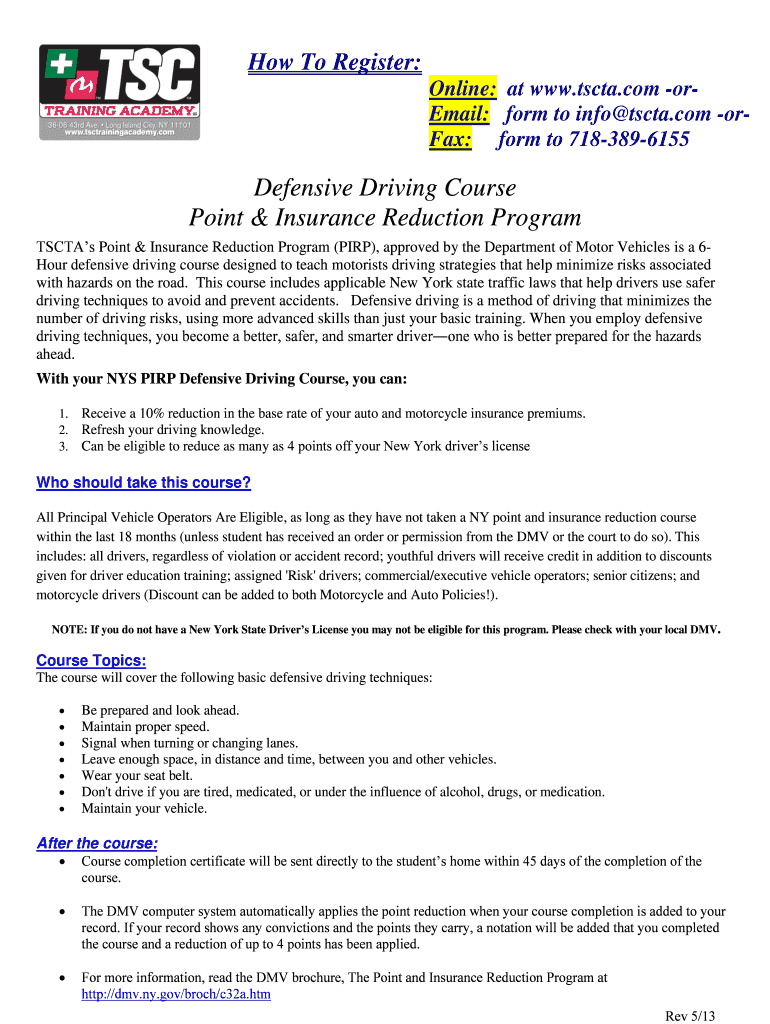 How To Register: Online: at www.tscta.com remain: form to info tscta.com oral: form to 7183896155 Defensive Driving Course Point & Insurance Reduction Program TCAS Point & Insurance Reduction Program