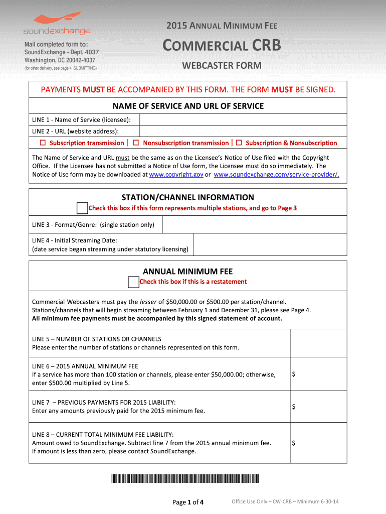 2015 ANNUAL MINIMUM FEE COMMERCIAL CRB Mail completed form to: SoundExchange Dept. 4037 Washington, DC 200424037 WEBCASTER FORM (for other delivery, see page 4, SUBMITTING) PAYMENTS MUST BE ACCOMPANIED