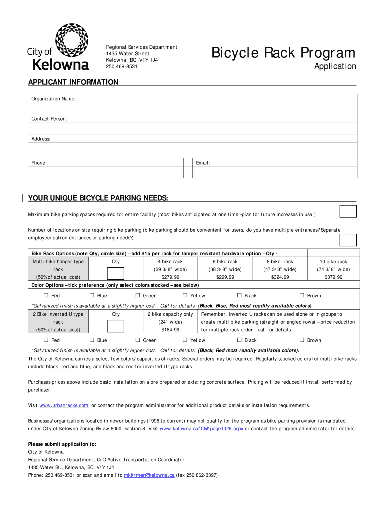 Bicycle Rack Program Regional Services Department 1435 Water Street Kelowna, BC V1Y 1J4 250 4698531 Application APPLICANT INFORMATION Organization Names: Contact Person: Address: Phone: Email: YOUR