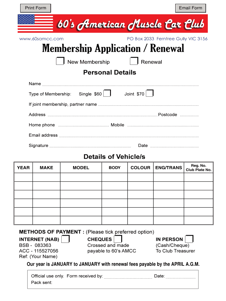 Print Form Email Form 60s American Muscle Car Club www.60samcc.com PO Box 2033 Fern tree Gully VIC 3156 Membership Application / Renewal New Membership Renewal Personal Details Name Type of Membership: