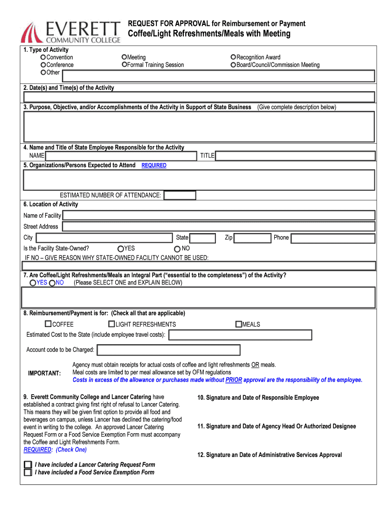 Get the free REQUEST FOR APPROVAL for Reimbursement or Payment Coffee - everettcc