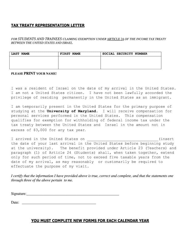 TAX TREATY REPRESENTATION LETTER FOR STUDENTS AND TRAINEES CLAIMING EXEMPTION UNDER ARTICLE 24 OF THE INCOME TAX TREATY BETWEEN THE UNITED STATES AND ISRAEL. LAST NAME FIRST NAME SOCIAL SECURITY NUMBER