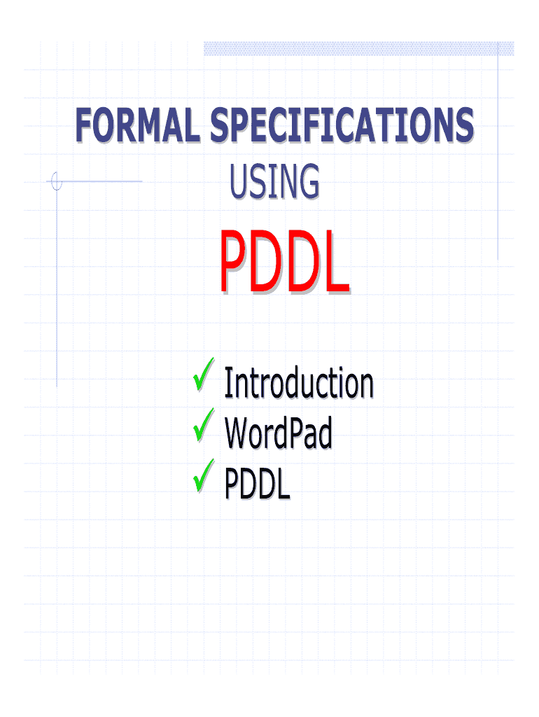 FORMAL SPECIFICATIONS USINGPDDLIntroduction Worded PDDLFormal Specification Intro can describe a system using specification languages. Here we see how CDDL can be used to describe a system. CDDL primarily