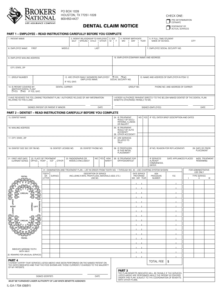BROKERS PO BOX 1028 HOUSTON, TX 772511028 8006534427 NATIONAL LIFE ASSURANCE COMPANY CHECK ONE: DENTAL CLAIM NOTICE PRE DETERMINATION ESTIMATE STATEMENT OF ACTUAL SERVICES PART 1 EMPLOYEE READ INSTRUCTIONS