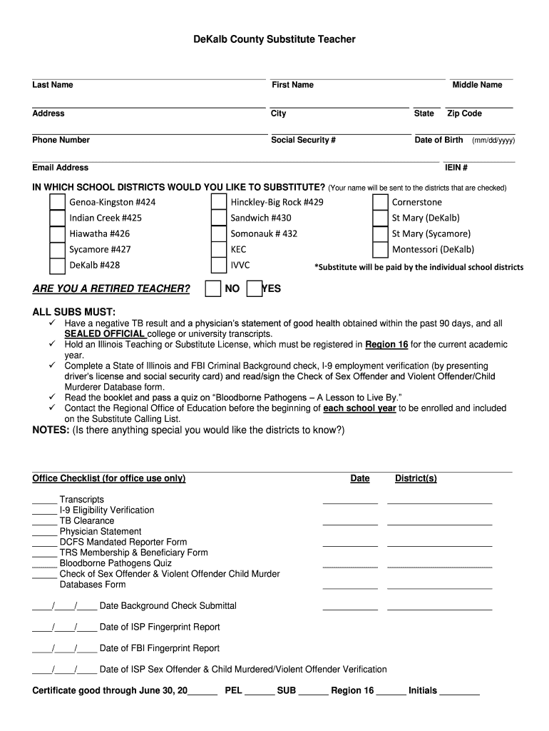 DeKalb County Substitute Teacher Last Name First Name Middle Name Address City State Zip Code Phone Number Social Security # Date of Birth (mm/dd/YYY) Email Address VEIN # IN WHICH SCHOOL DISTRICTS