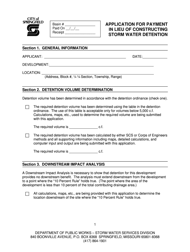 Basin # Paid On / / Receipt APPLICATION FOR PAYMENT IN LIEU OF CONSTRUCTING STORM WATER DETENTION Section 1. GENERAL INFORMATION APPLICANT: DATE: DEVELOPMENT: LOCATION: (Address, Block #, Section,