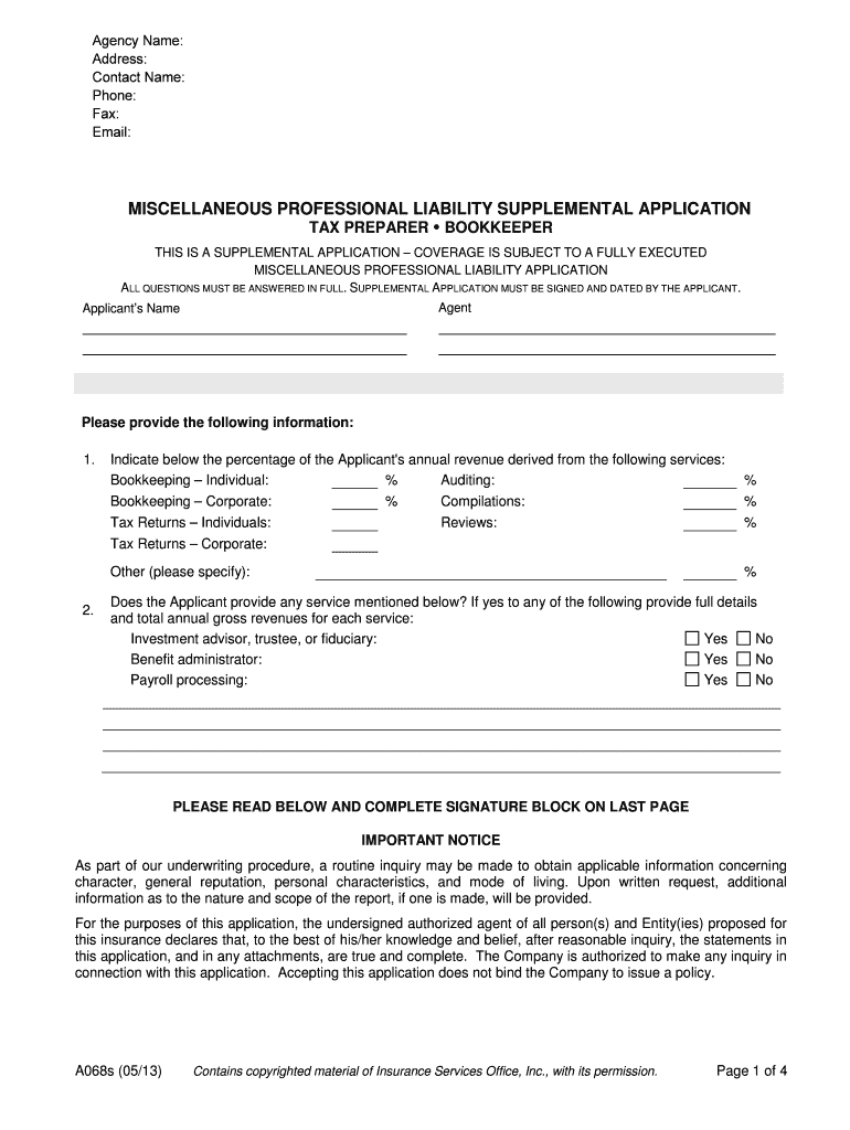 Agency Name: Address: Contact Name: Phone: Fax: Email: MISCELLANEOUS PROFESSIONAL LIABILITY SUPPLEMENTAL APPLICATION TAX PREPARER BOOKKEEPER THIS IS A SUPPLEMENTAL APPLICATION COVERAGE IS SUBJECT