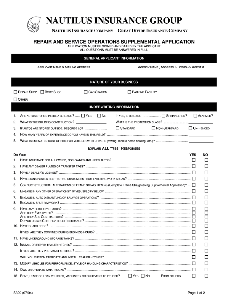 NAUTILUS INSURANCE GROUP NAUTILUS INSURANCE COMPANY GREAT DIVIDE INSURANCE COMPANY REPAIR AND SERVICE OPERATIONS SUPPLEMENTAL APPLICATION MUST BE SIGNED AND DATED BY THE APPLICANT ALL QUESTIONS MUST
