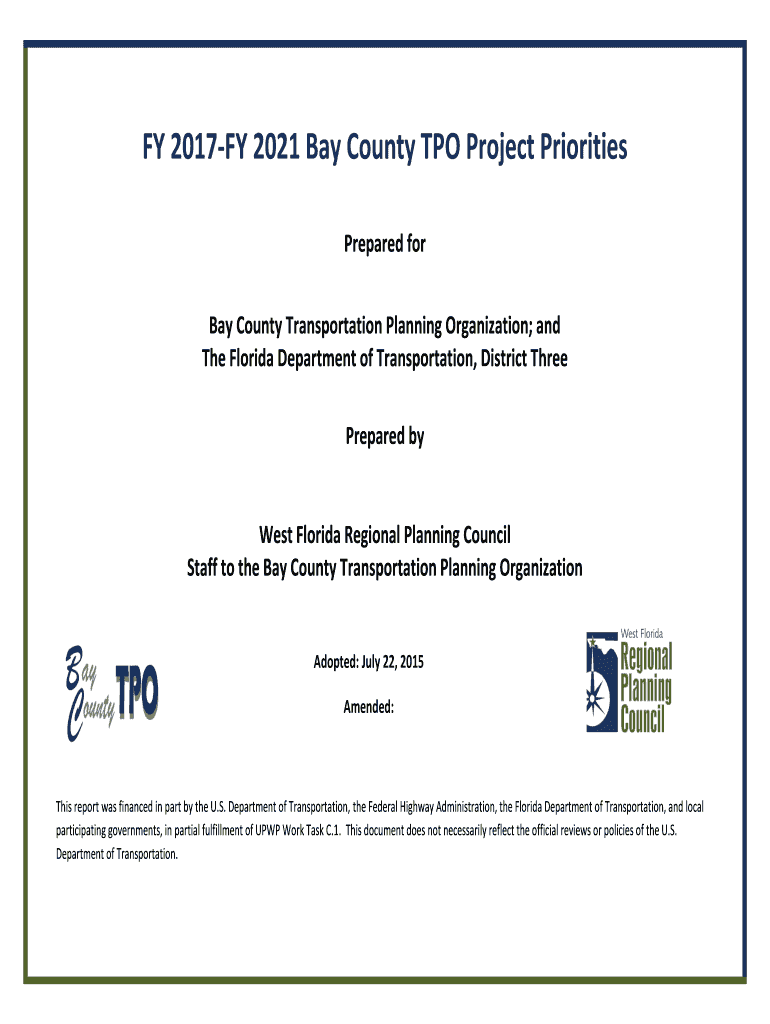 FY 2017FY 2021 Bay County TPO Project Priorities Prepared for Bay County Transportation Planning Organization; and The Florida Department of Transportation, District Three Prepared by West Florida