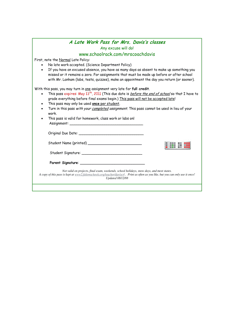 A Late Work Pass for Mrs. Davis's classes Any excuse will do! www.schoolrack.com/mrscoachdavis First, note the Normal Late Policy: No late work accepted. (Science Department Policy) If you have an