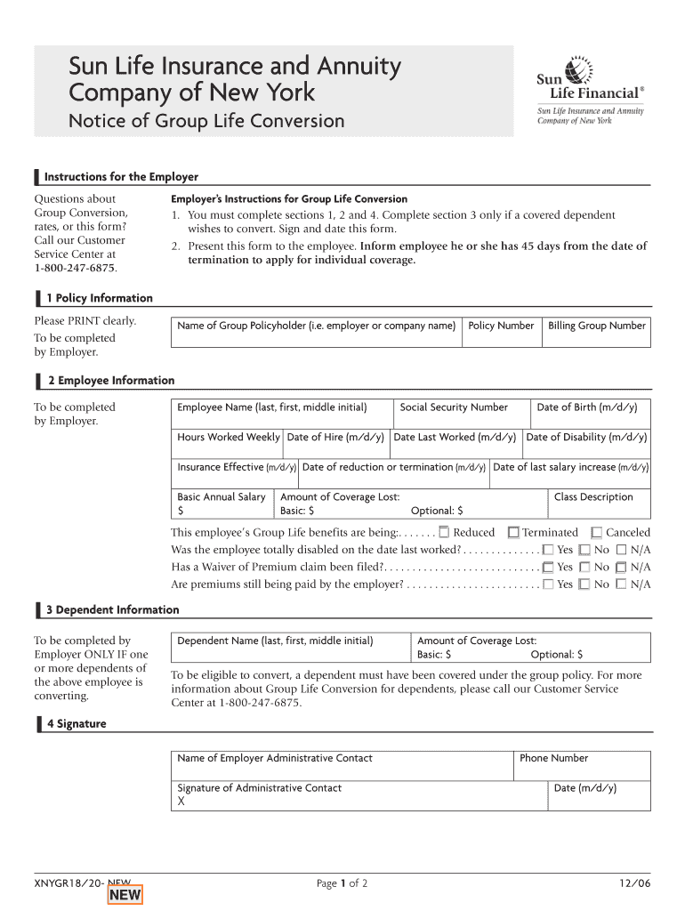 NEW Life Conversion Notice Use this form for employees terminating/losing coverage on 12/1/2006 or later. Sun Life Insurance and Annuity Company of New York Notice of Group Life Conversion Instructions