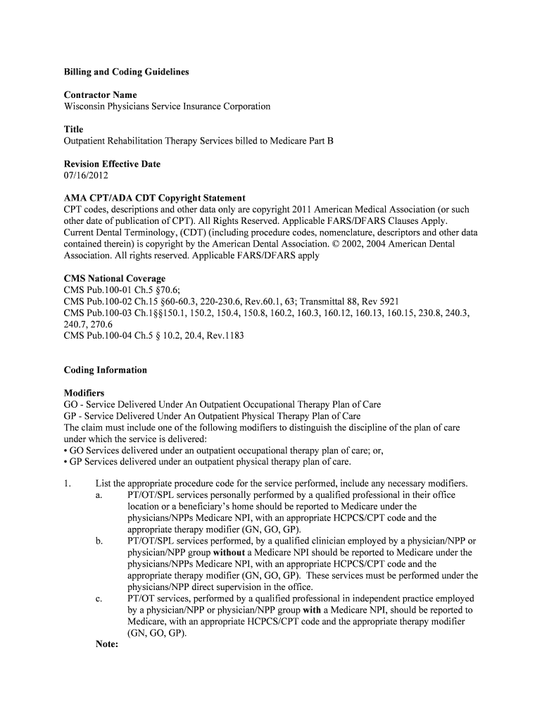 This document provides guidelines for billing and coding pertaining to outpatient rehabilitation therapy services under Medicare Part B, detailing modifiers, ICD-9 coding, evaluation requirements,