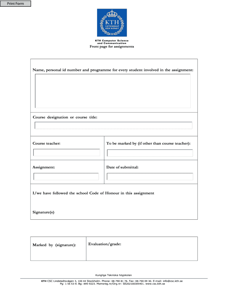 Print Form Front page for assignments Name, personal ID number and program for every student involved in the assignment: Course designation or course title: Course teacher: To be marked by (if other