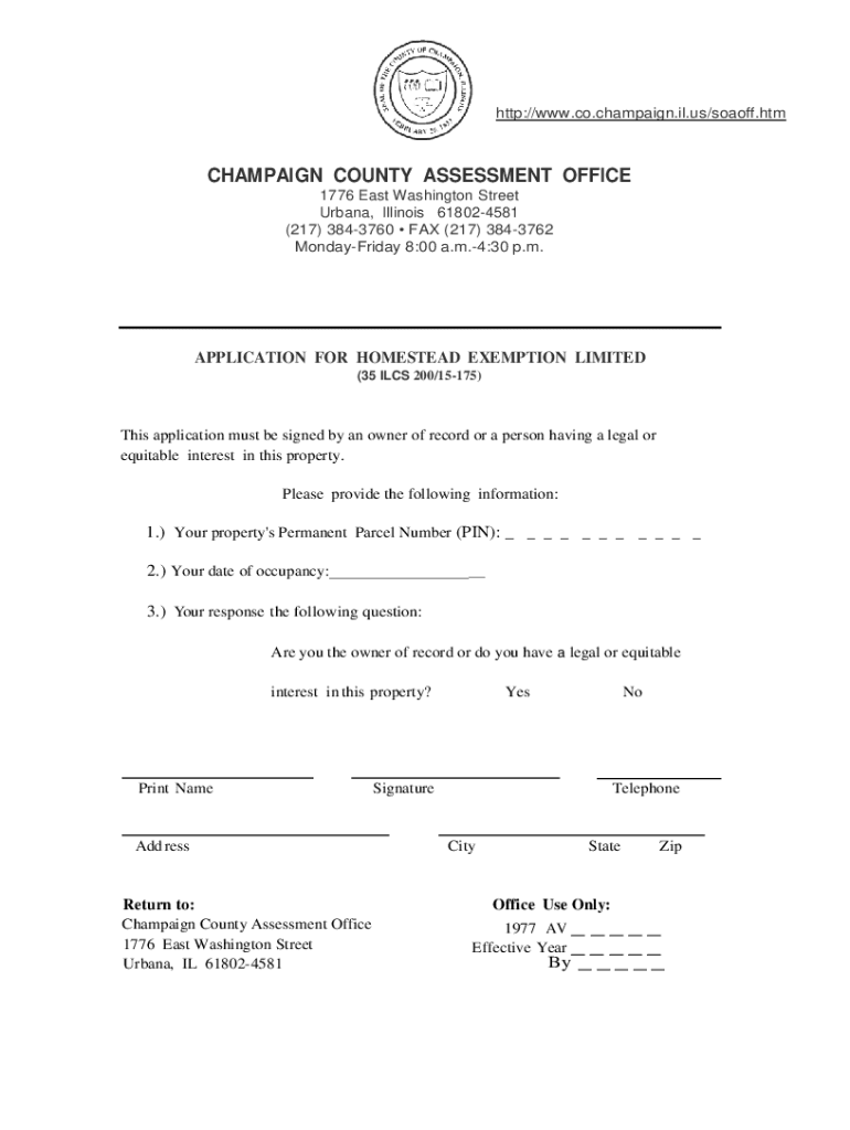 HTTP://www.co.champaign.il.us/soaoff.htmCHAMPAIGN COUNTY ASSESSMENT OFFICE 1776 East Washington Street Urbana, Illinois 618024581 (217) 3843760 FAX (217) 3843762 Monday Friday 8:00 a.m.4:30 p.m.APPLICATION