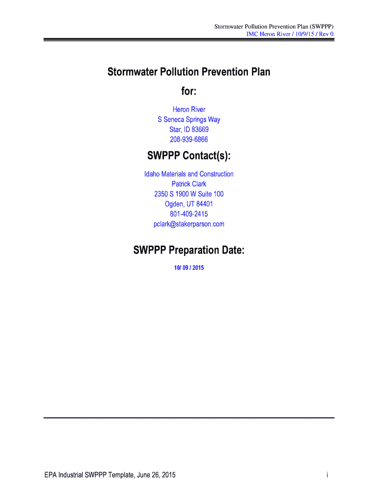 Stormwater Pollution Prevention Plan (SW PPP) IMC Heron River / 10/9/15 / Rev 0 Stormwater Pollution Prevention Plan for: Heron River S Seneca Springs Way Star, ID 83669 2089396866 SW PPP Contact(s):