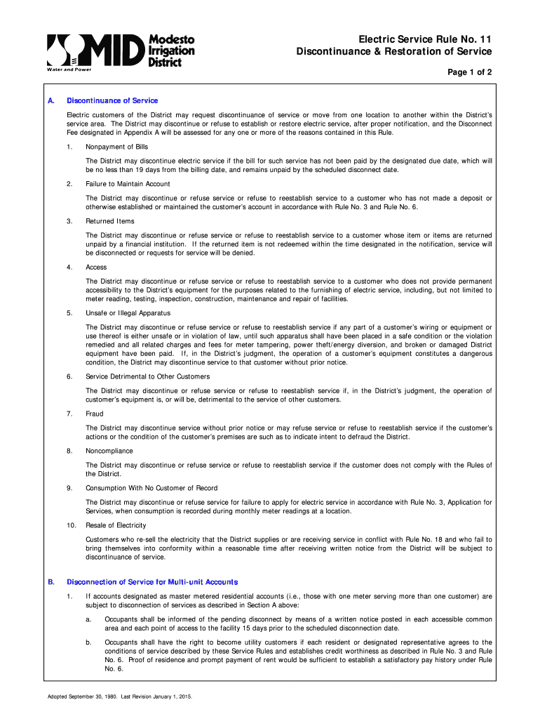 Electric Service Rule No. 11 Discontinuance & Restoration of Service Page 1 of 2 A. Discontinuance of Service Electric customers of the District may request discontinuance of service or move from