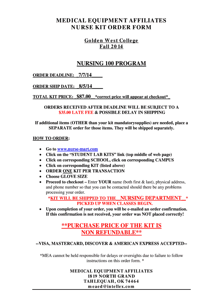 MEDICAL EQUIPMENT AFFILIATES NURSE KIT ORDER FORM Golden West College Fall 2014 NURSING 100 PROGRAM ORDER DEADLINE: 7/7/14 ORDER SHIP DATE: 8/5/14 TOTAL KIT PRICE: $87.00 *correct price will appear